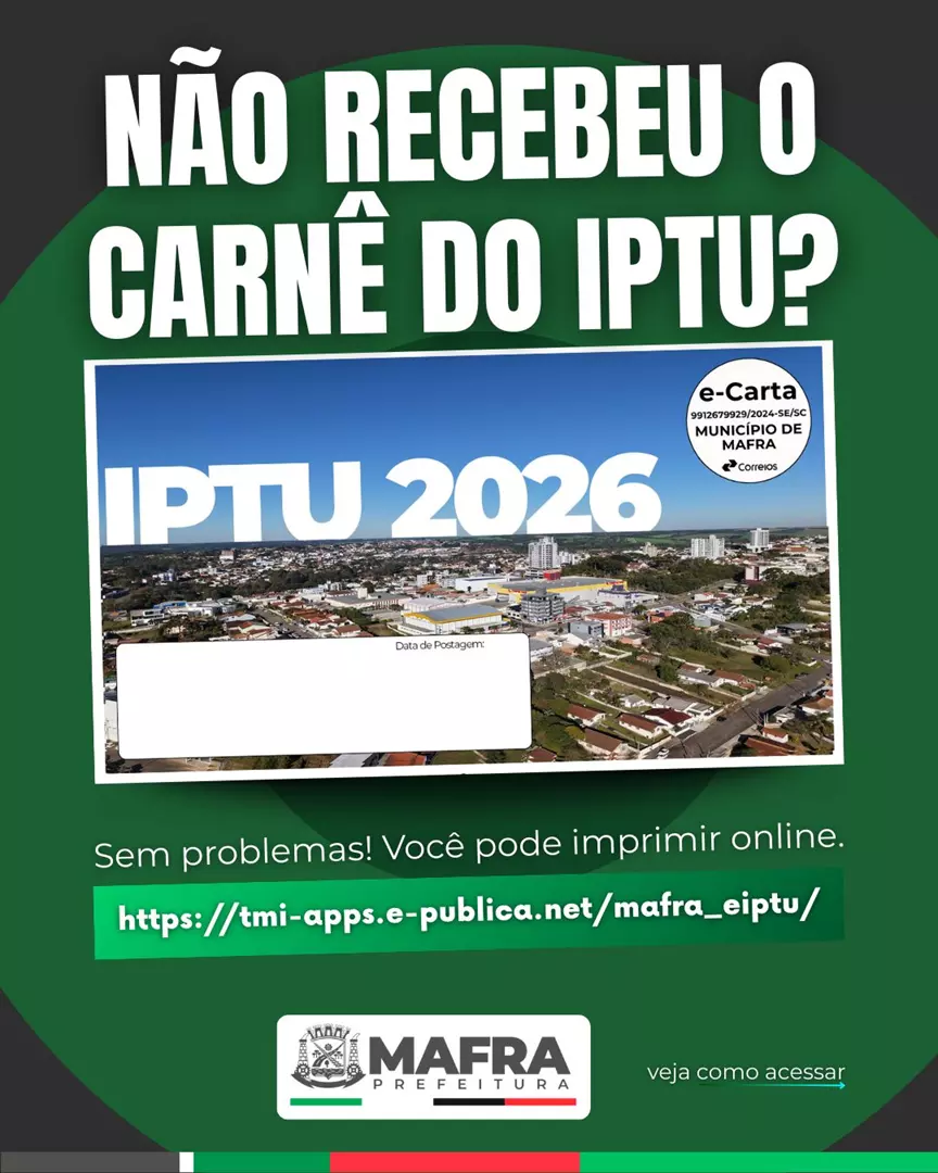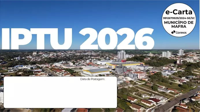 A Prefeitura de Mafra informou que os carnês do IPTU 2026 começarão a ser enviados aos contribuintes a partir de 15 de dezembro, antecipando a entrega para facilitar o planejamento financeiro da população. O imposto poderá ser pago em cota única, com desconto de 10%, ou parcelado ao longo do ano.